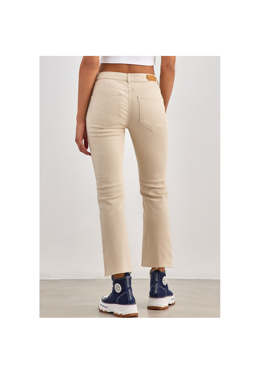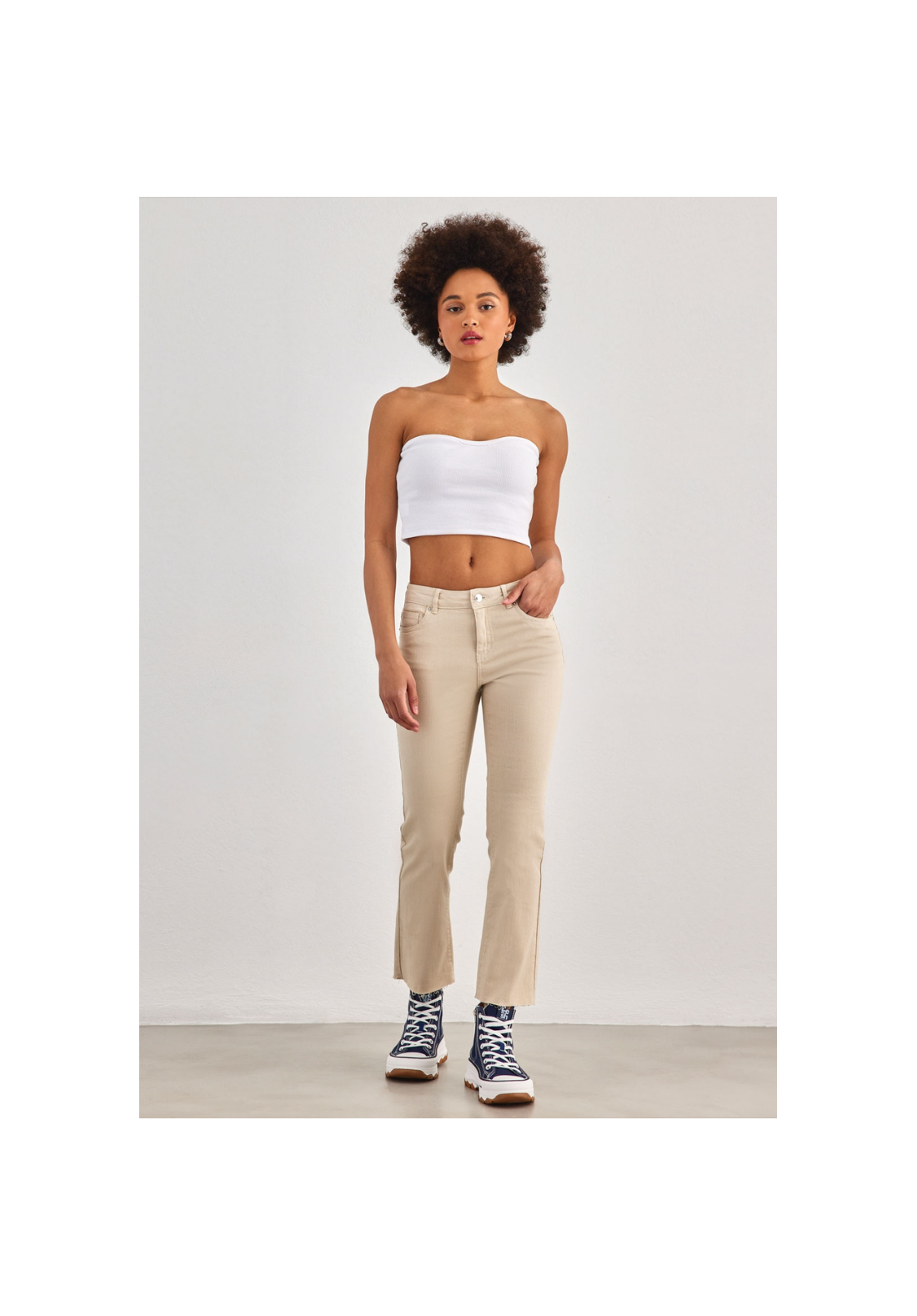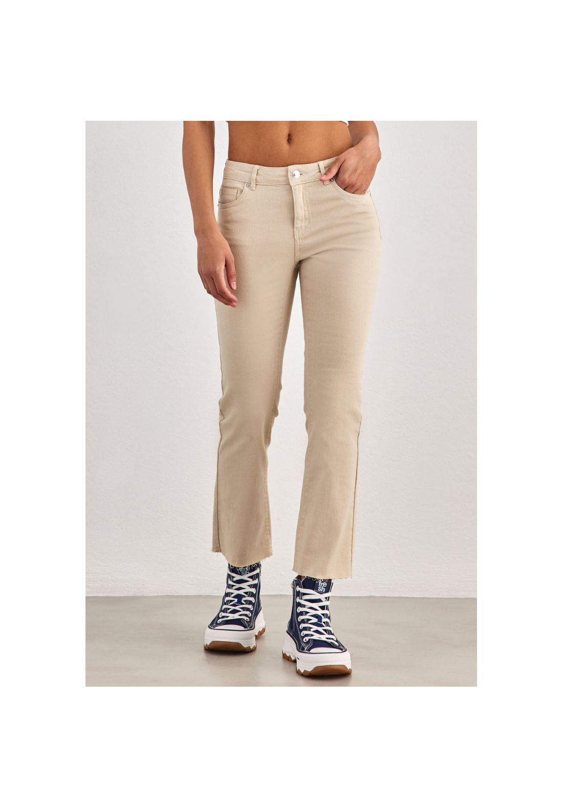 Corte flare, tiro medio con botón y cremallera.