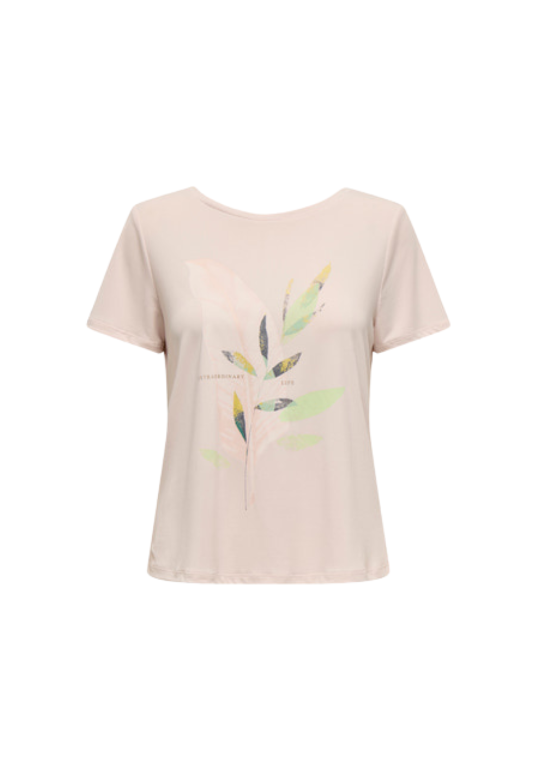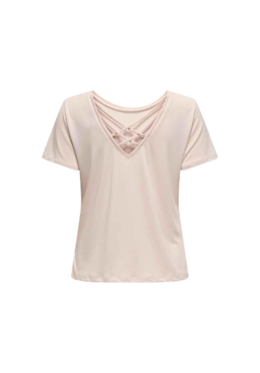Camiseta de corte recto, longitud de cuerpo normal, manga corta, cuello redondo y cuello en forma de pico con tiras decorativas en la espalda.