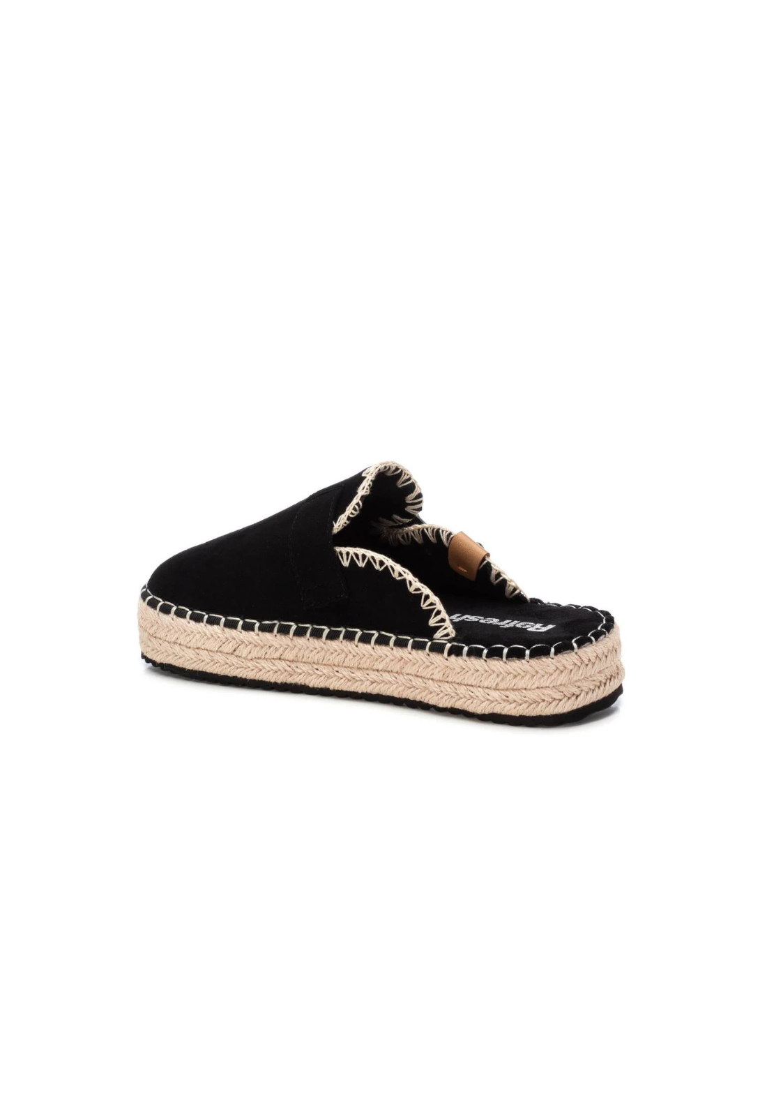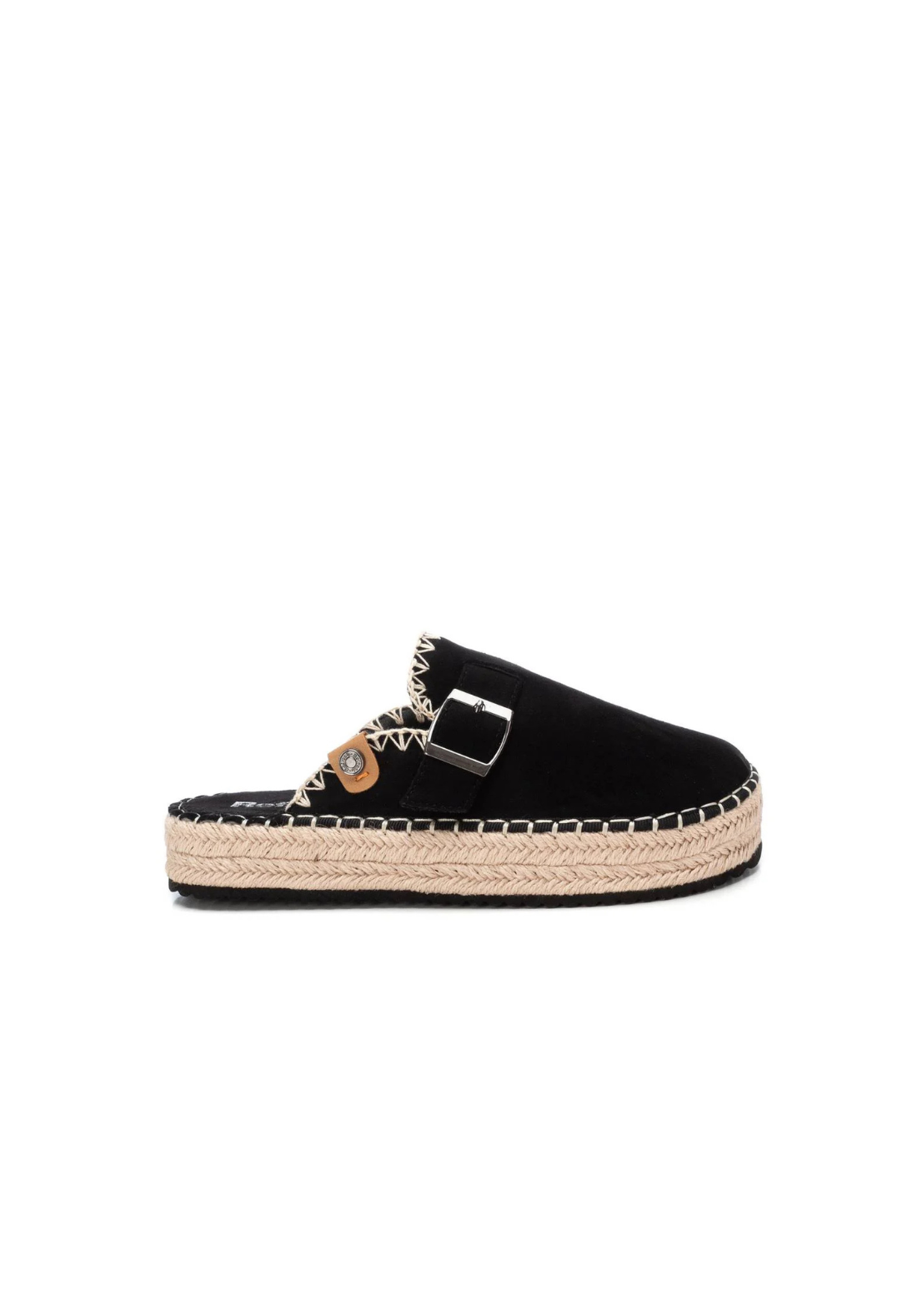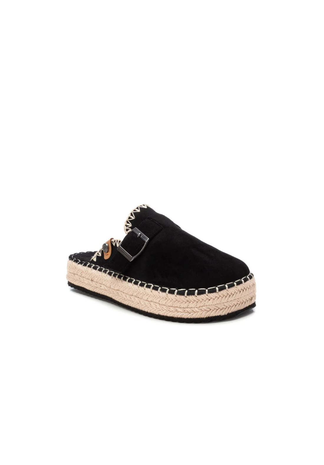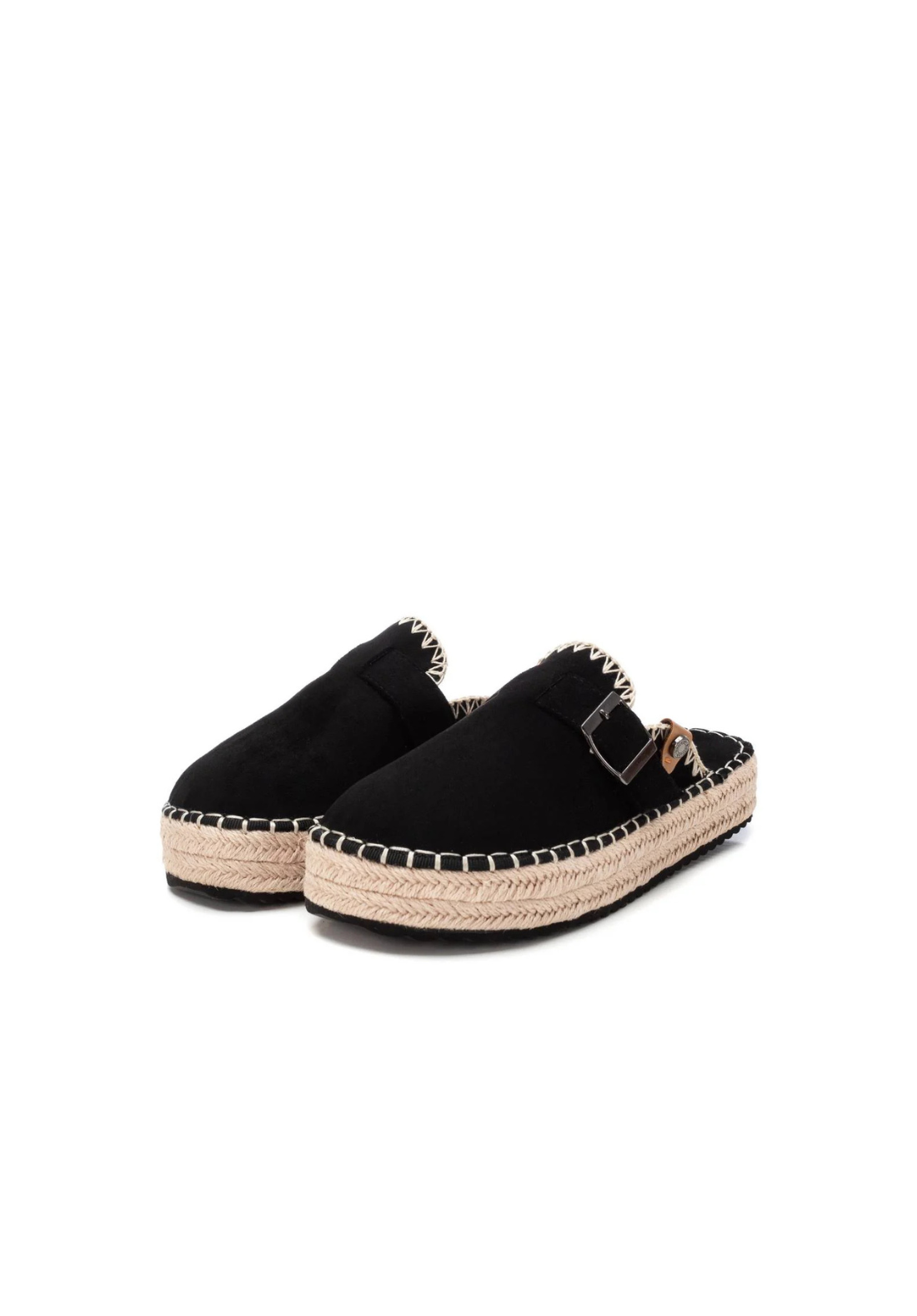 Zueco fabricado en suave antelina con correa ajustable y hebilla. Cómoda planta. Plataforma recubierta en tiras de yute con suela canalada de goma antideslizante. Modelo vegano.