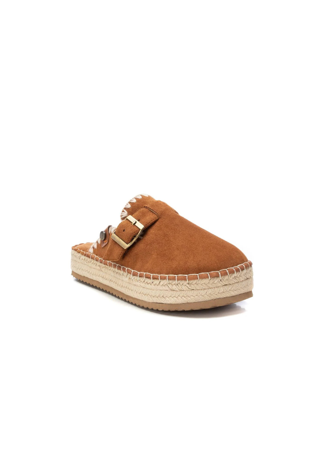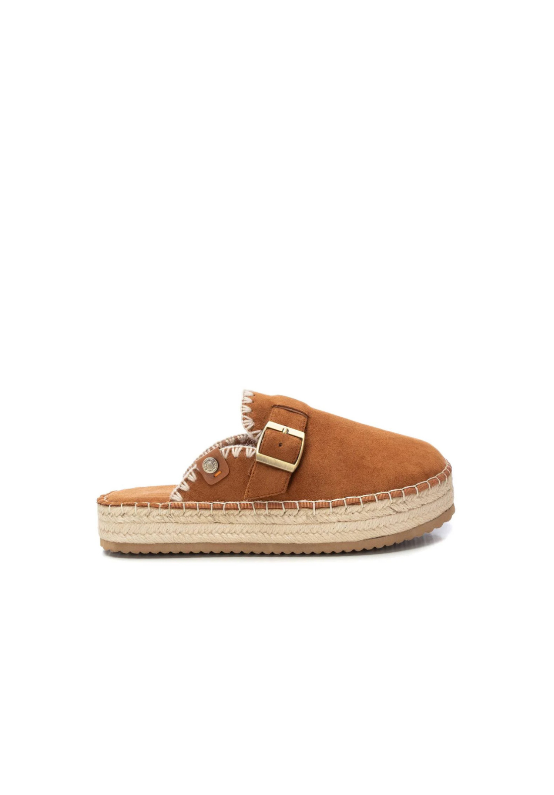 Zueco fabricado en suave antelina con correa ajustable y hebilla. Cómoda planta. Plataforma recubierta en tiras de yute con suela canalada de goma antideslizante. Modelo vegano.