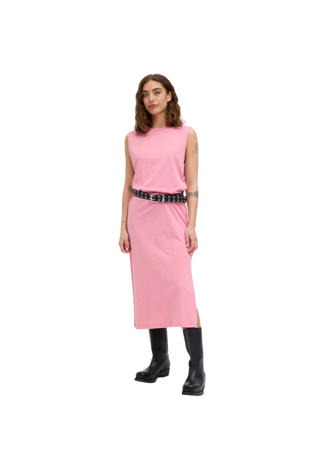 Vestido de cuello redondo, sin mangas.