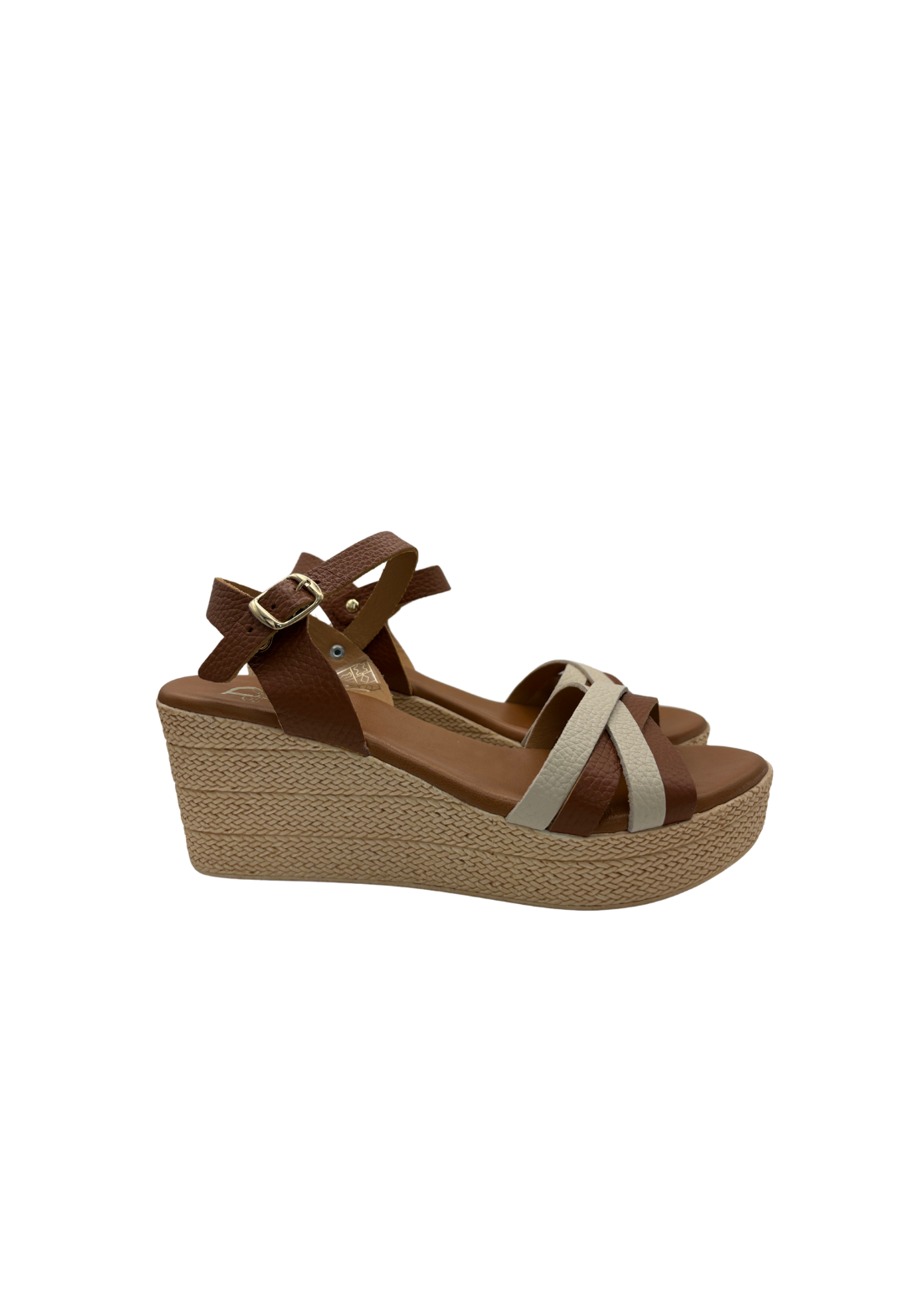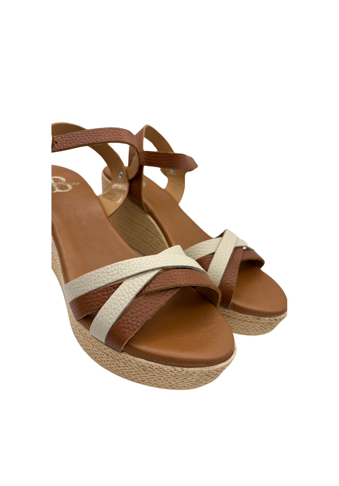 Sandalia de cuña con tiras bicolores y cierre con hebilla alrededor del tobillo.