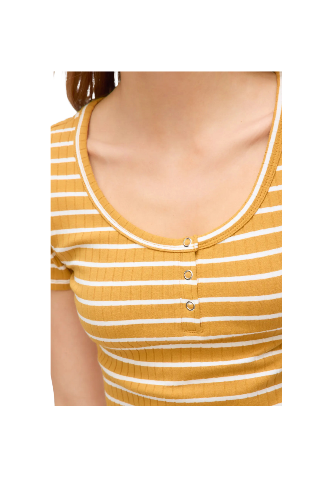 Camiseta de rayas de manga corta, de cuello redondo y botones tipo corchete en el pecho.