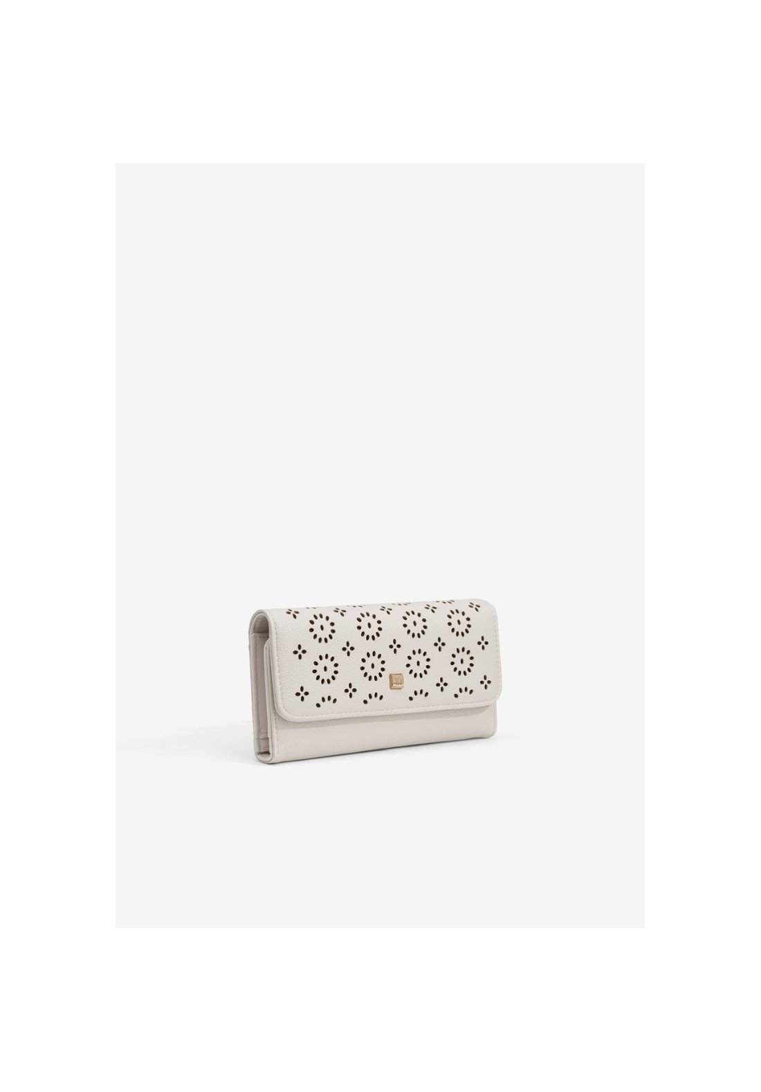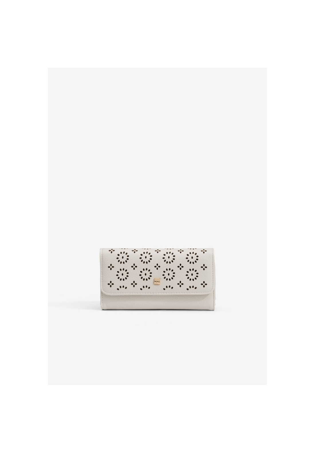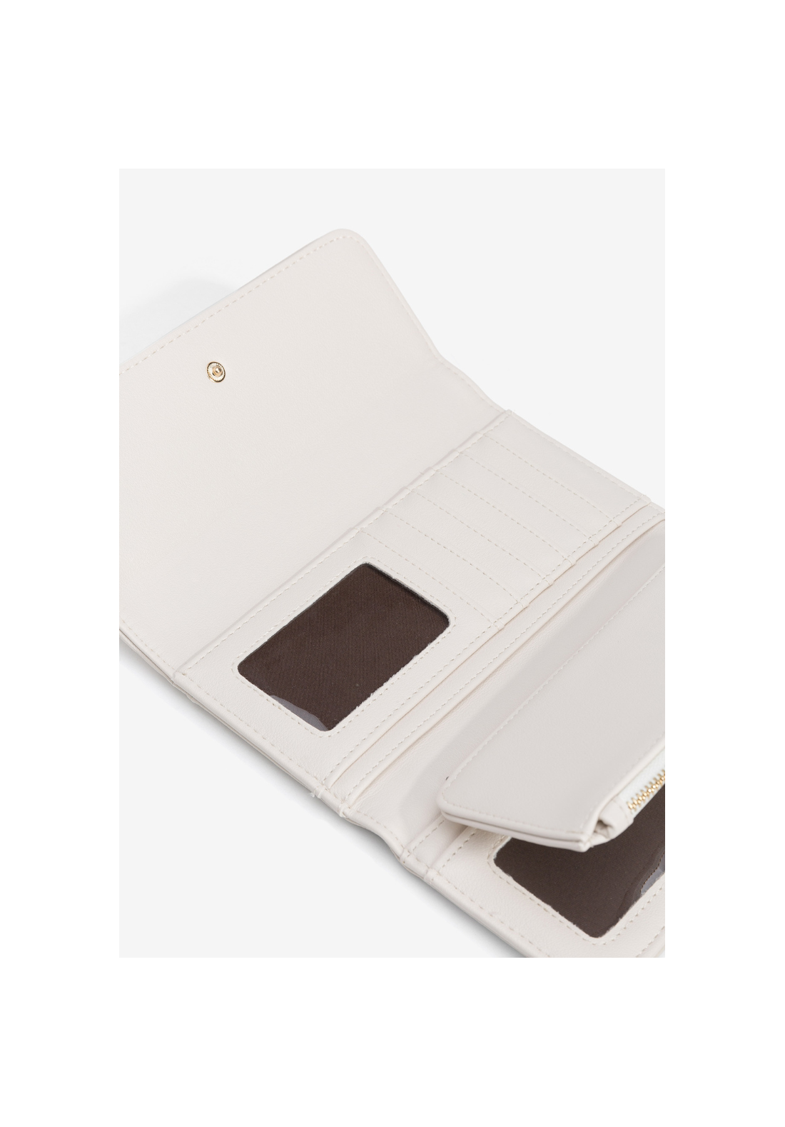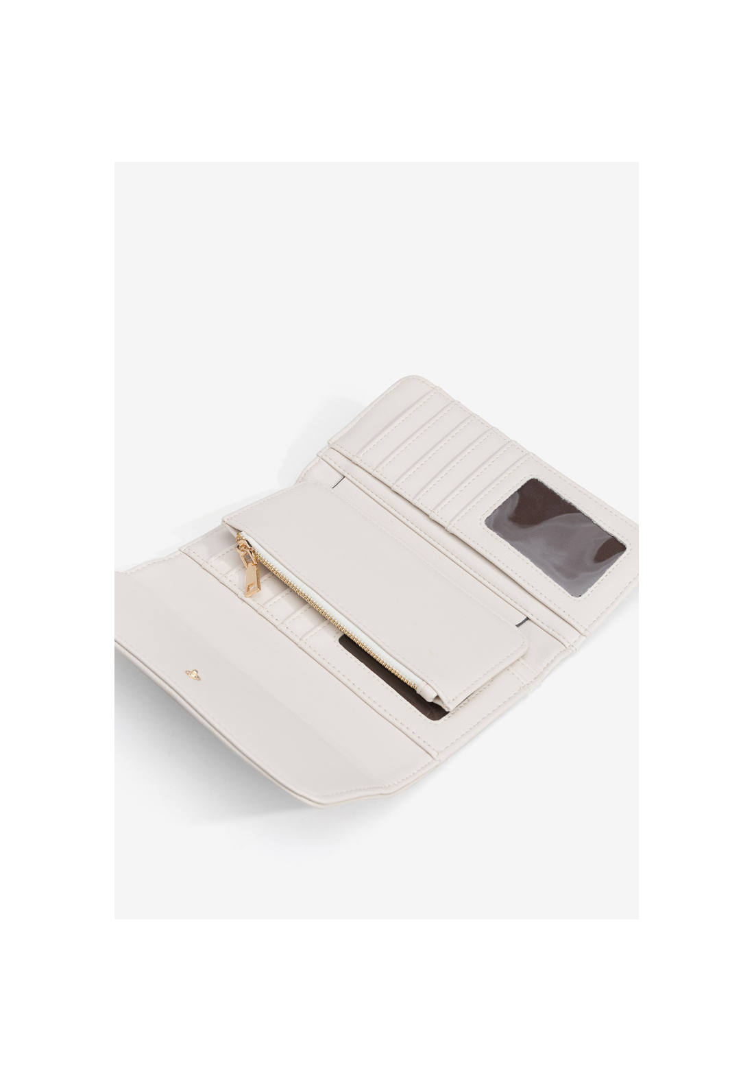 Monedero de efecto piel, con solapa perforado y botón de presión. Interior con compartimentos para tarjetas y para billetes y un bolsillo con cierre de cremallera.