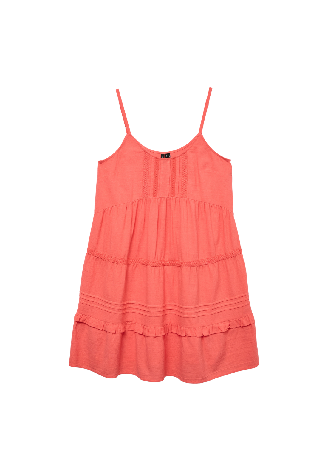 Vestido corto de tirantes y cuello redondo. Tiene detalle de encaje en el pecho.