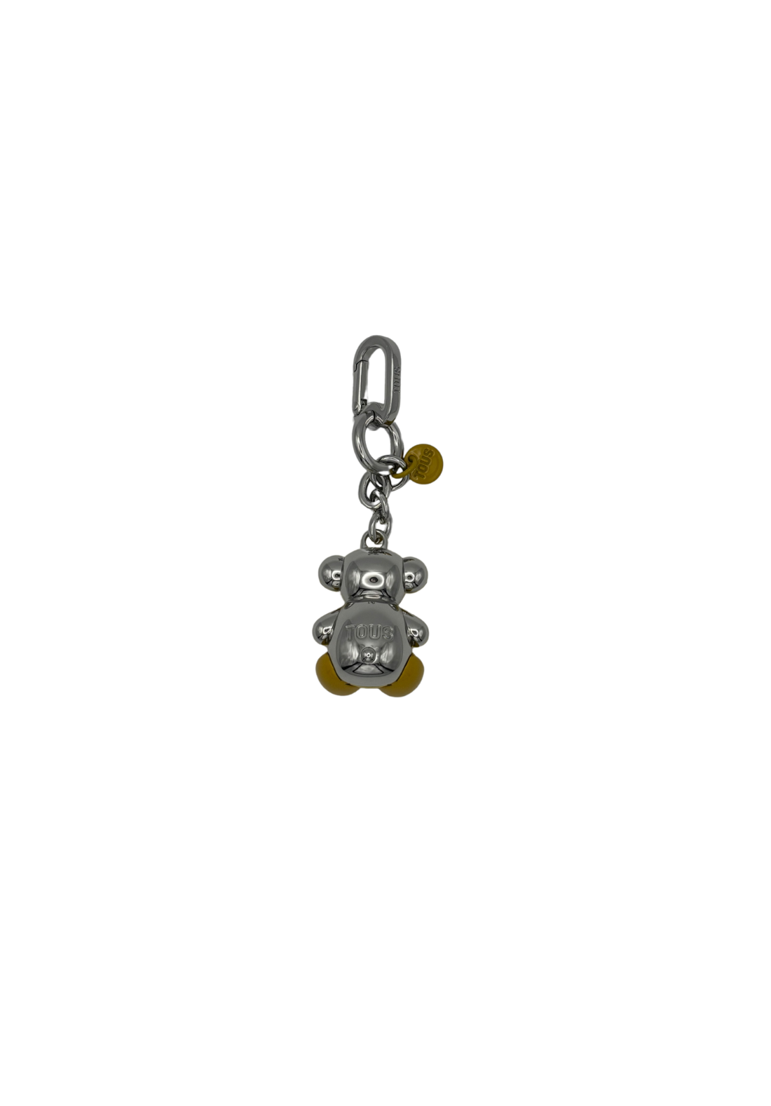 Llavero de oso de metal de la colección TOUS Bold Bear. Es amarillo por delante y plata por detrás.