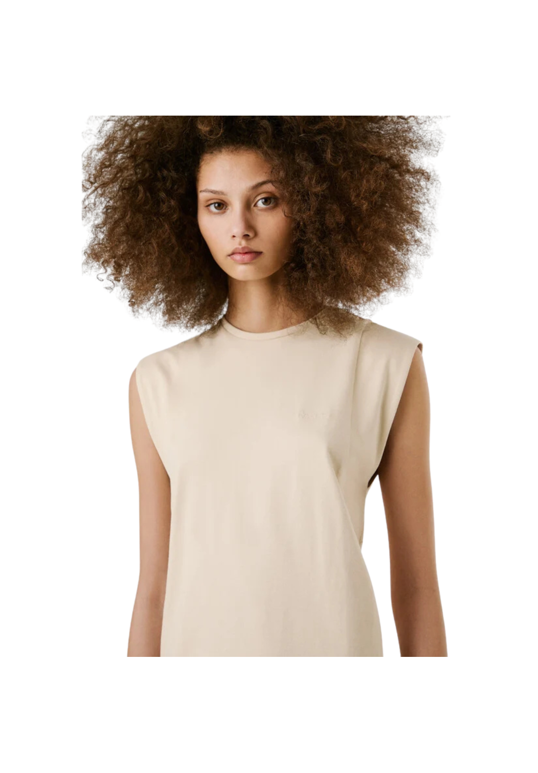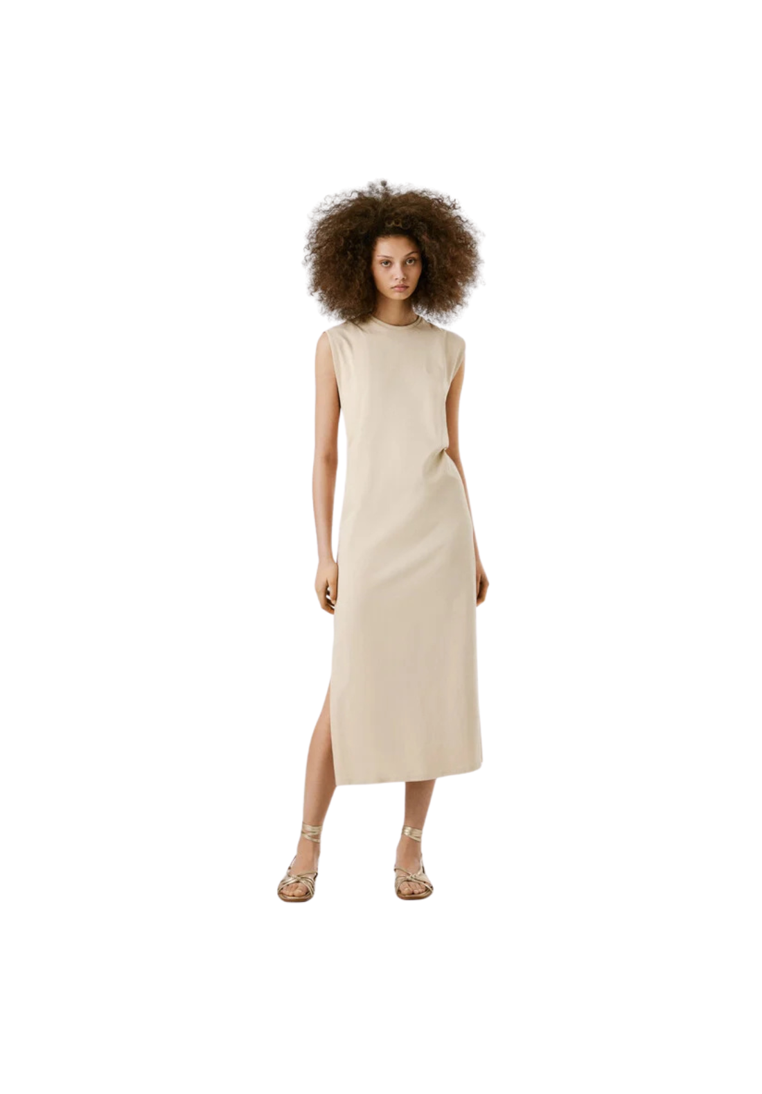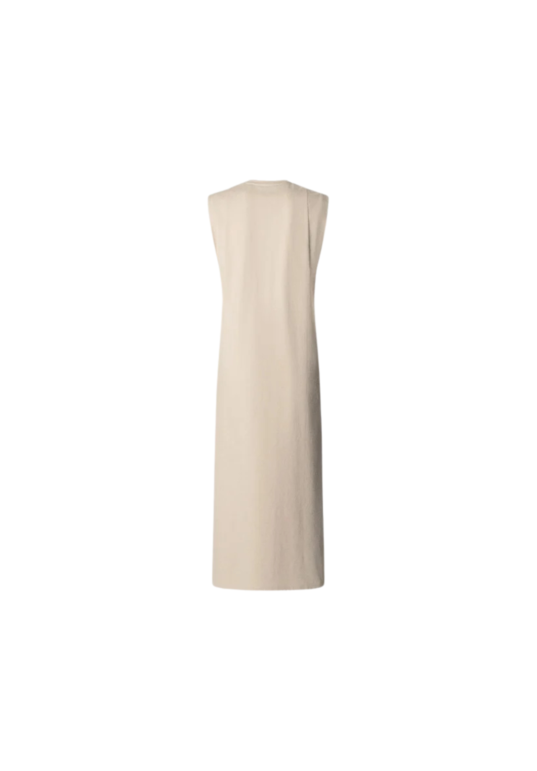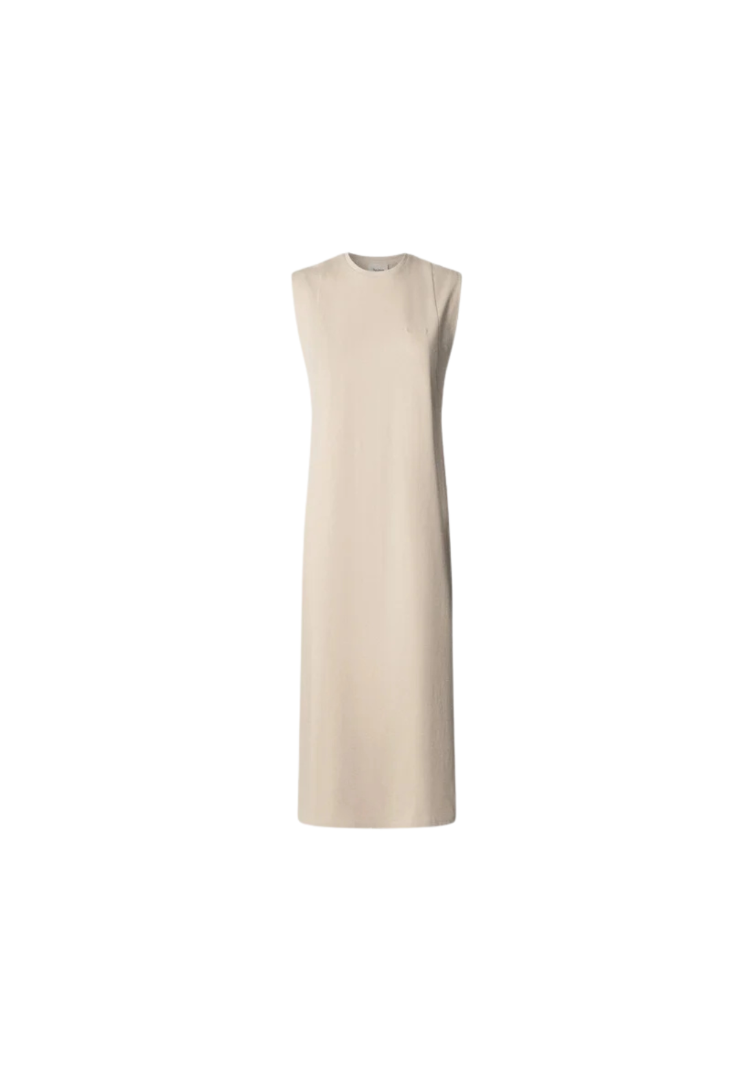 Vestido largo en tejido jersey con cuello redondo con detalle canalé. No tiene mangas y viene con detalle de dobladillo doble en las sisas. Tiene acabado doble pespunte en bajo.