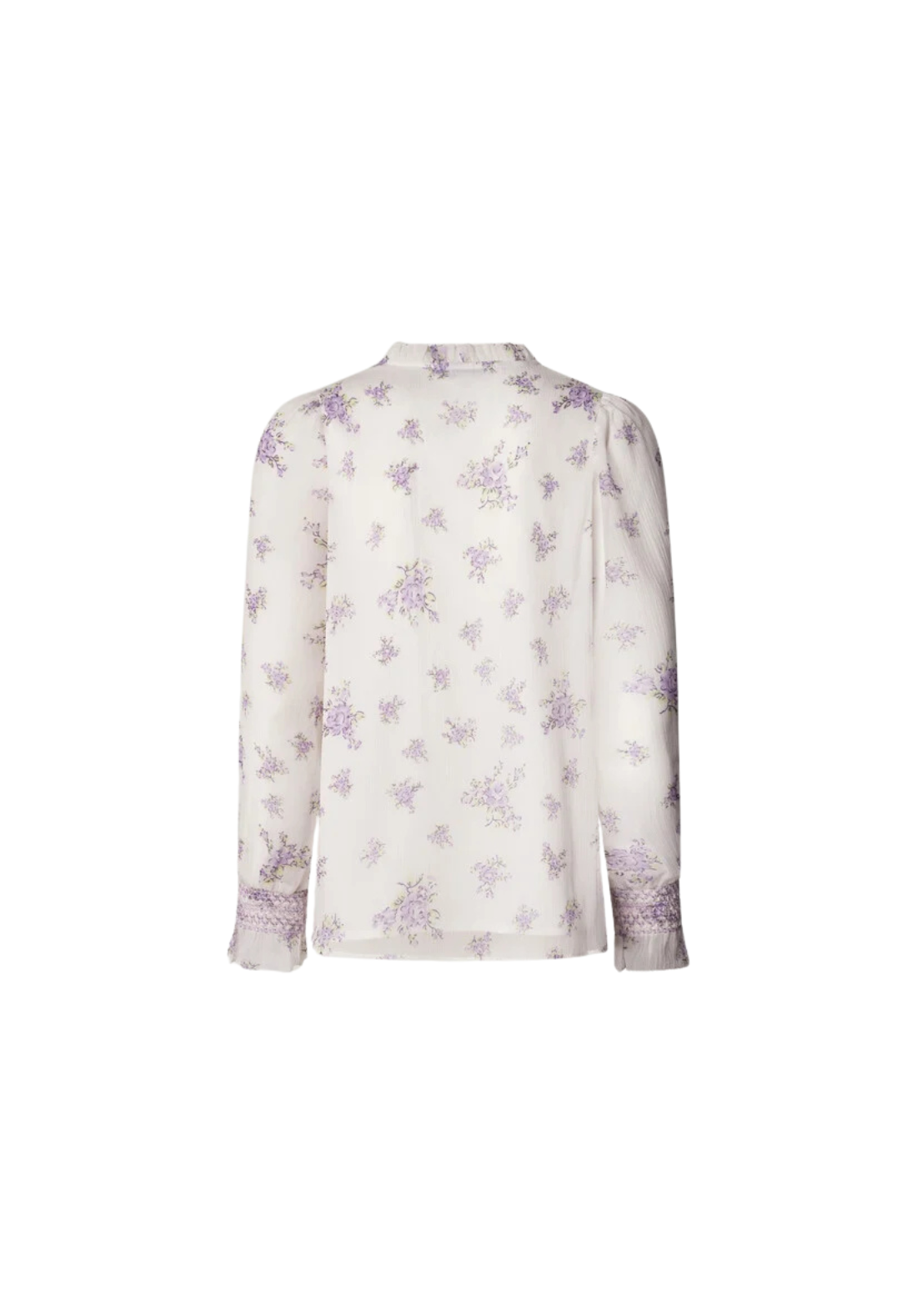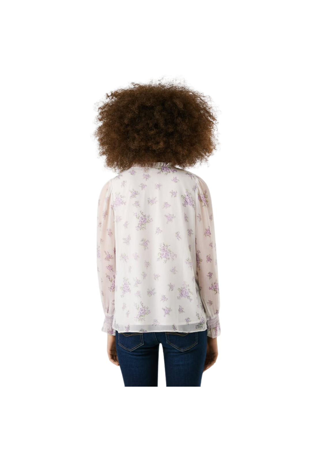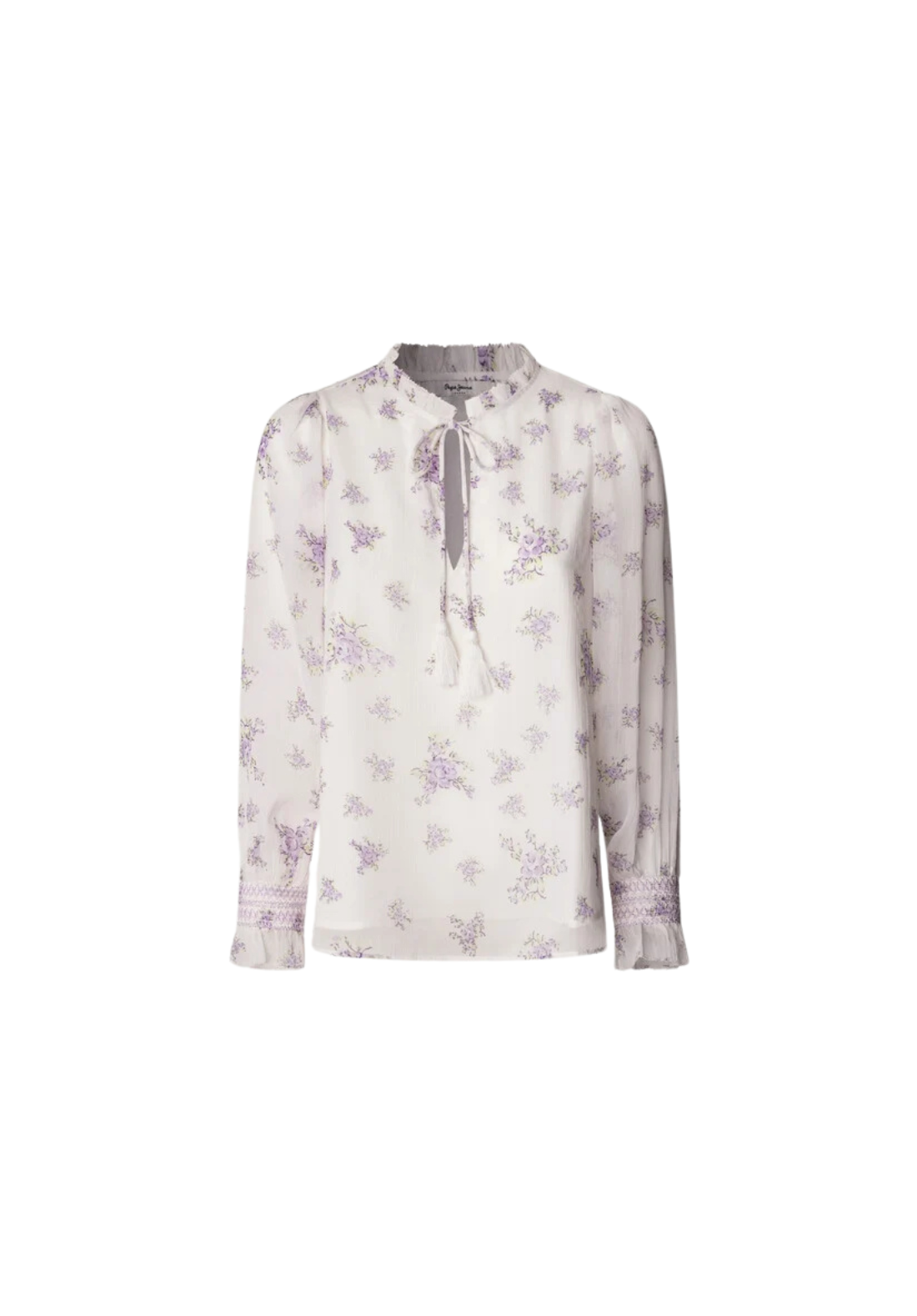 Blusa en tejido fluido de chifón arrugado de manga larga ligeramente abullonada. Tiene el cuello en pico y minivolantes y lazo ajustable. Viene con detalle de borlas en el lazo del cuello. El estampado es de flores y tiene un forro interior en forma de camisola.