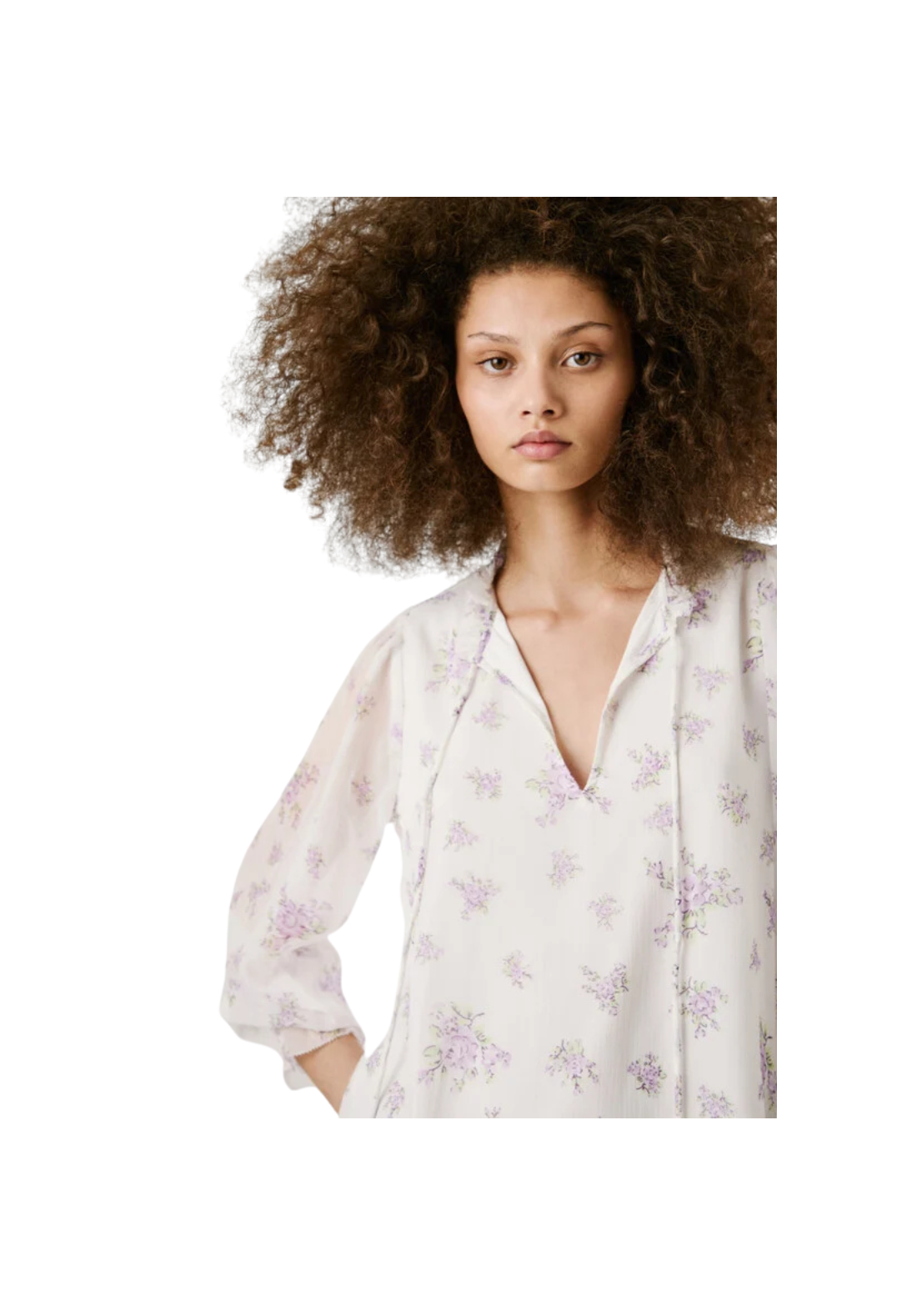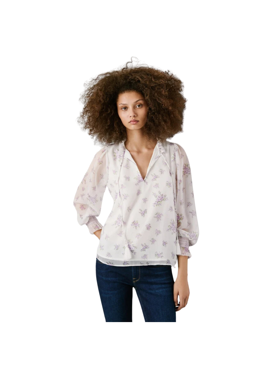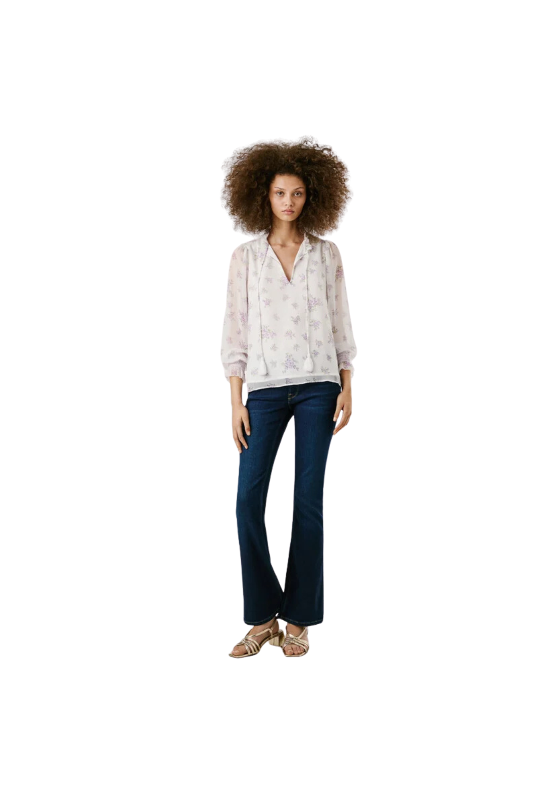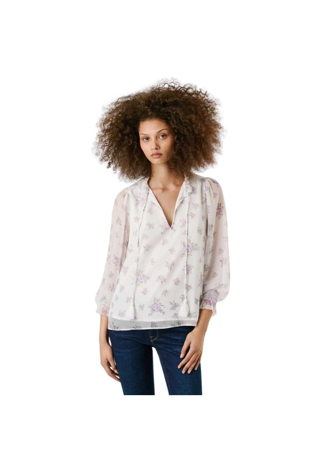 Blusa en tejido fluido de chifón arrugado de manga larga ligeramente abullonada. Tiene el cuello en pico y minivolantes y lazo ajustable. Viene con detalle de borlas en el lazo del cuello. El estampado es de flores y tiene un forro interior en forma de camisola.
