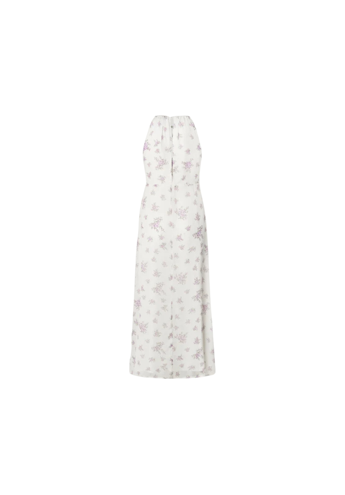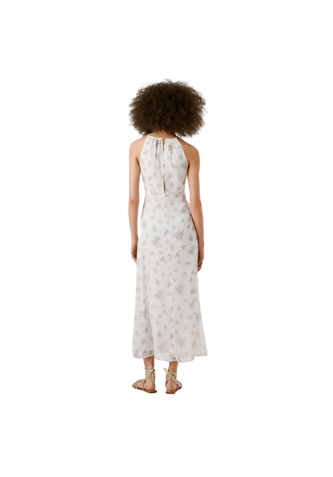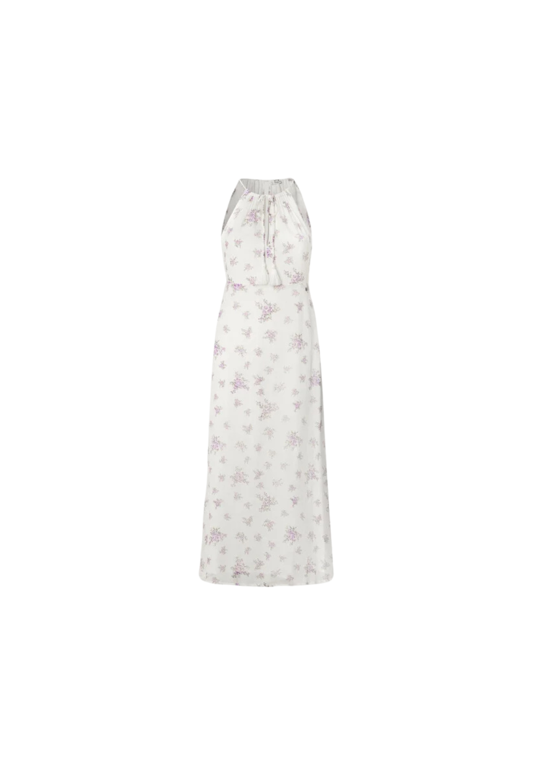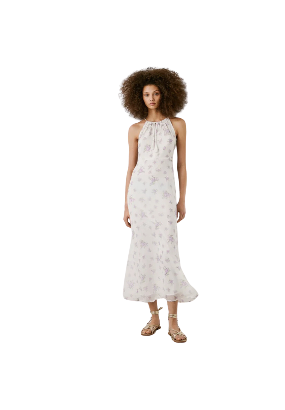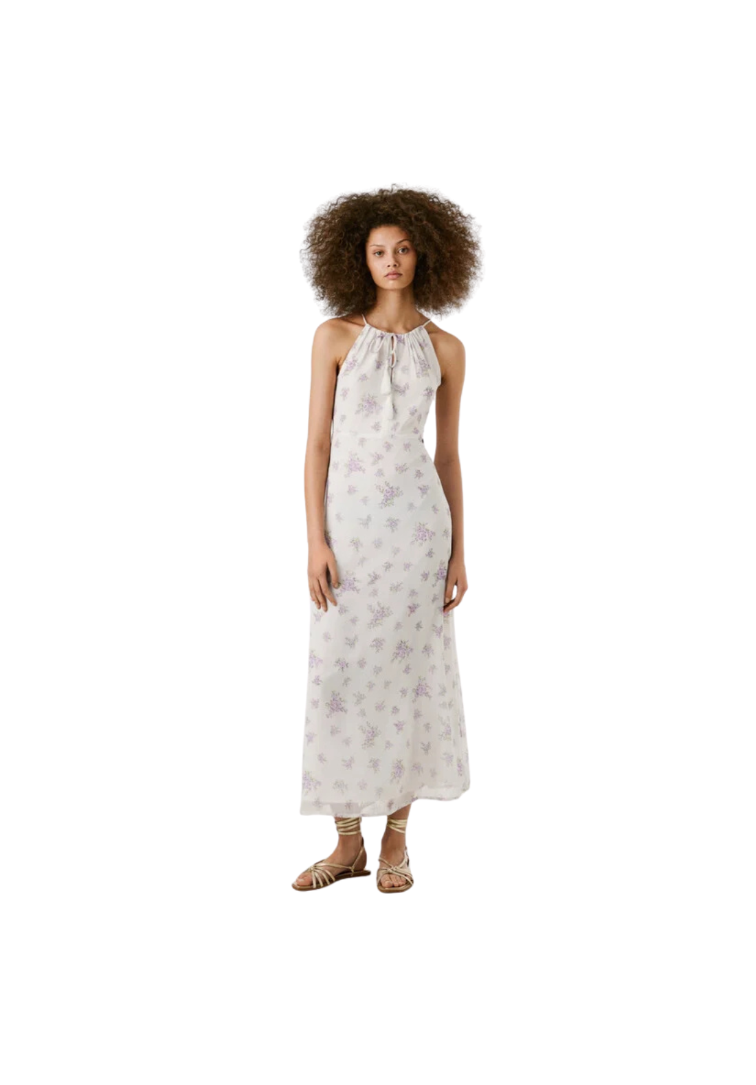Vestido largo ligero de gasa con cuello halter con lazo ajustable del mismo tejido. Detalle de borlas en los extremos del lazo. Gran abertura en la espalda y es con estampado de flores integral.