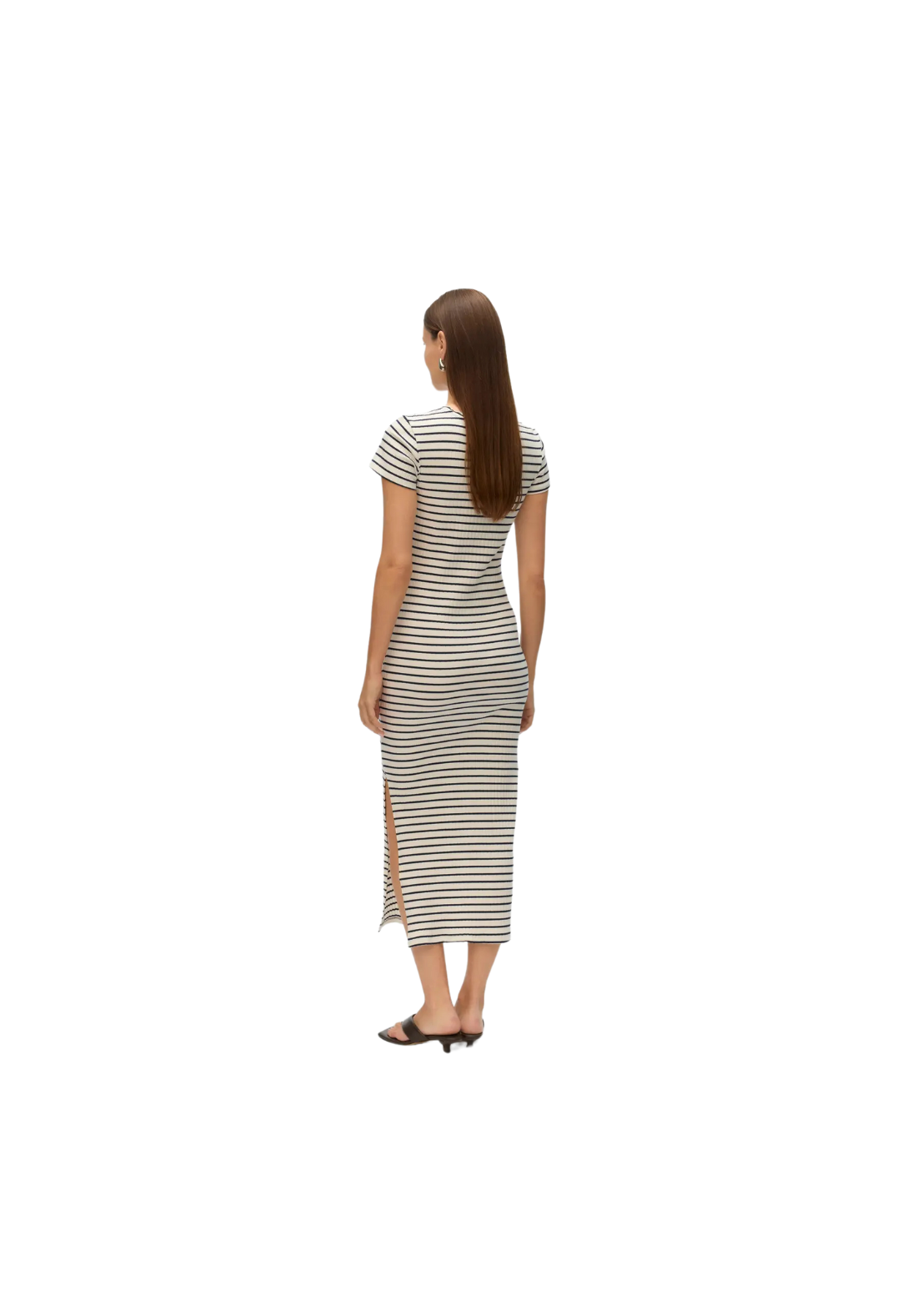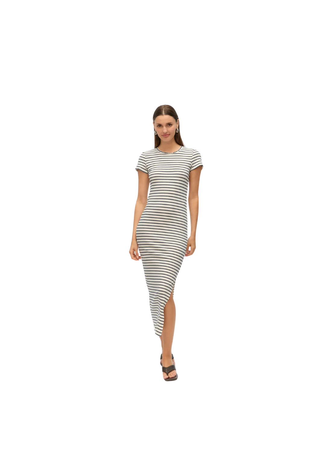 Vestido maxi de cuello redondo y manga corta. Tiene una abertura en la pierna.