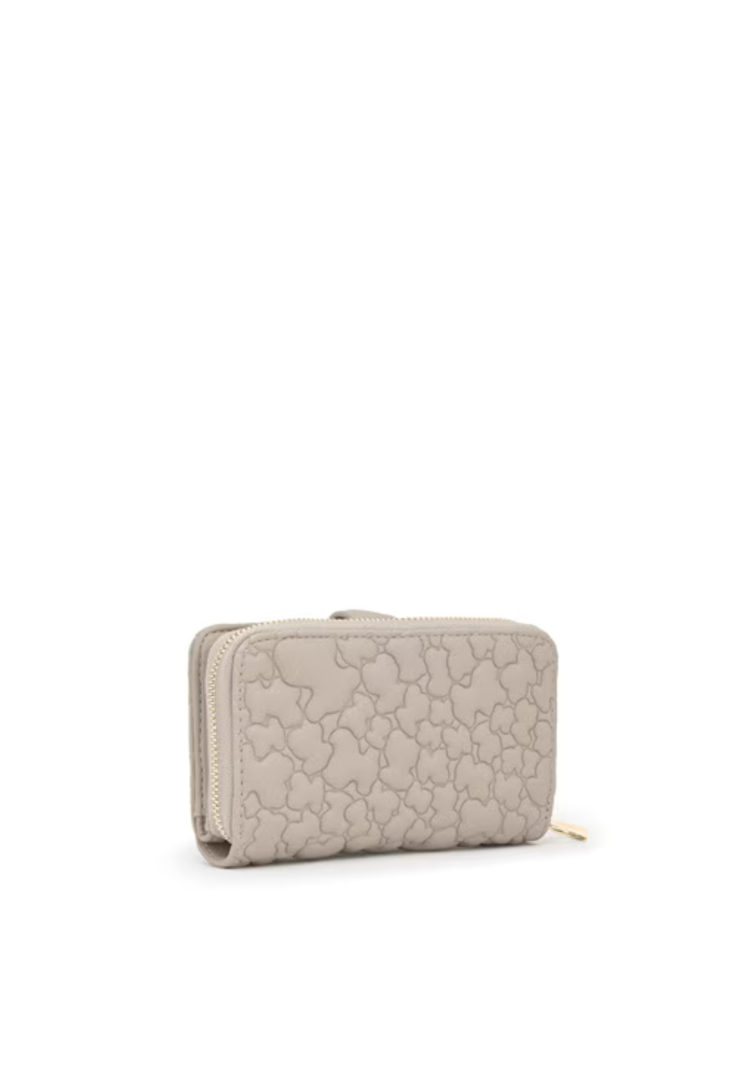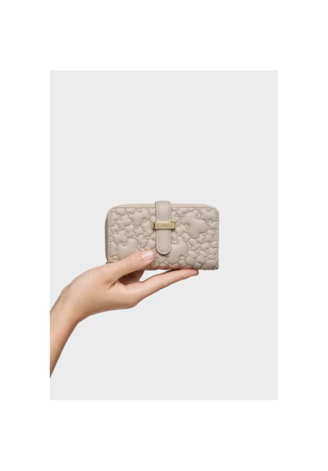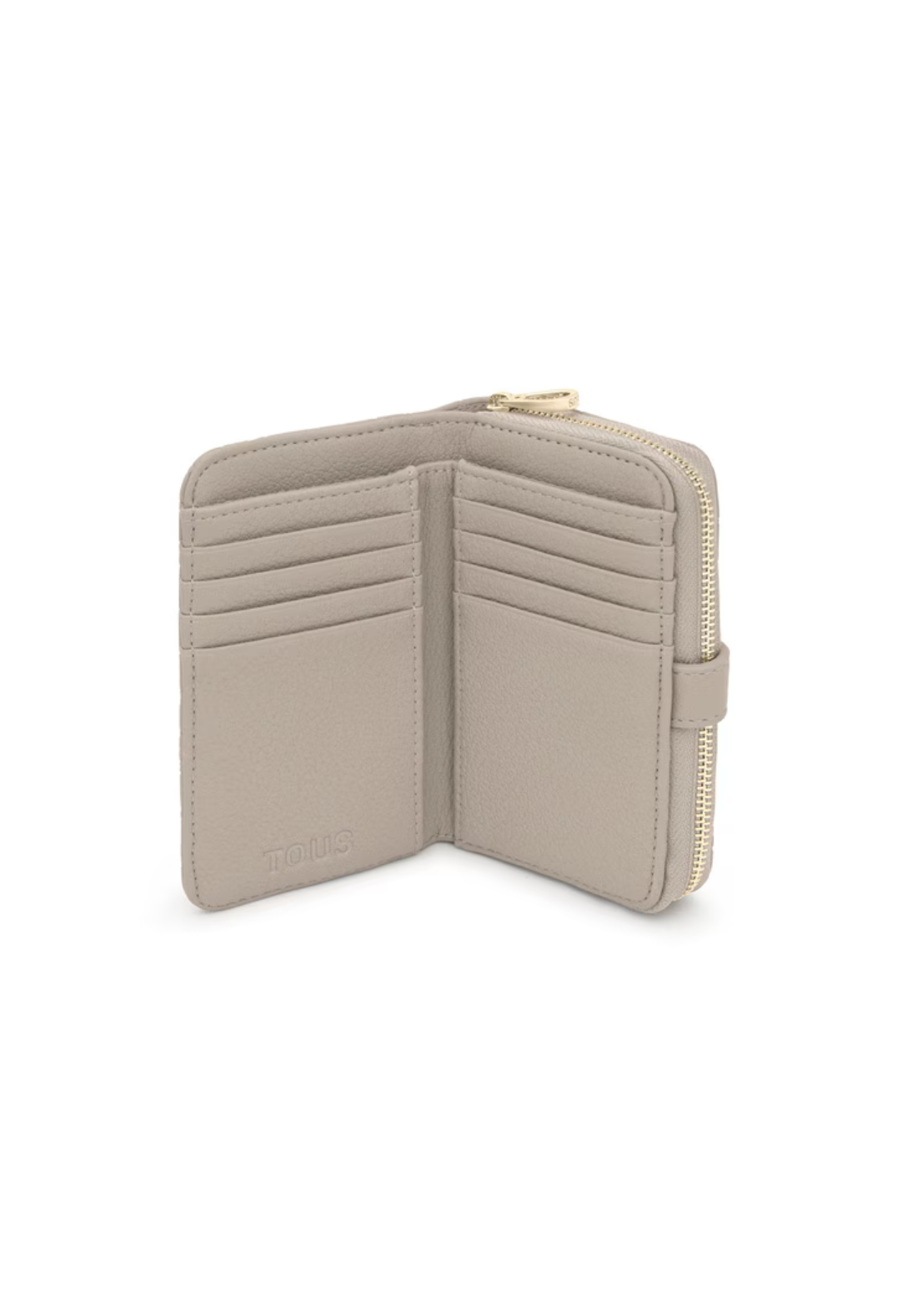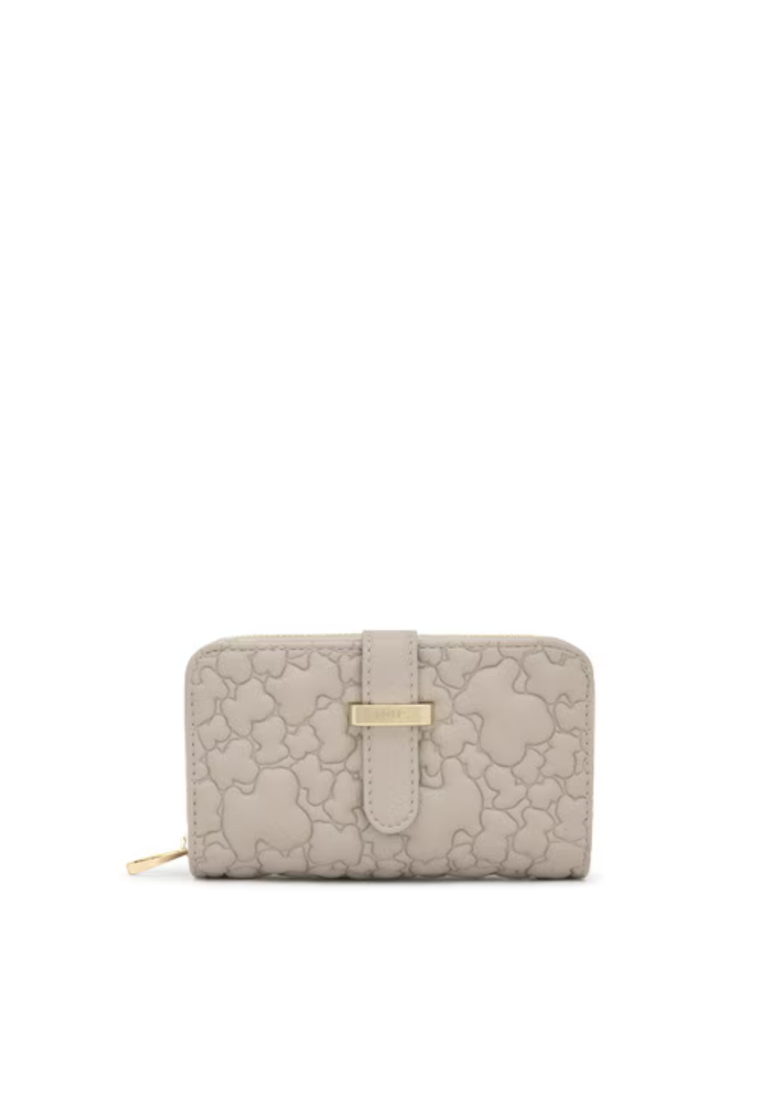 Billetera Bridge Puffy bear de poliuretano con cierre botón a presión y cremallera. En el interior contiene un compartimento para billetes, ocho ranuras para tarjetas y dos compartimentos para monedas.